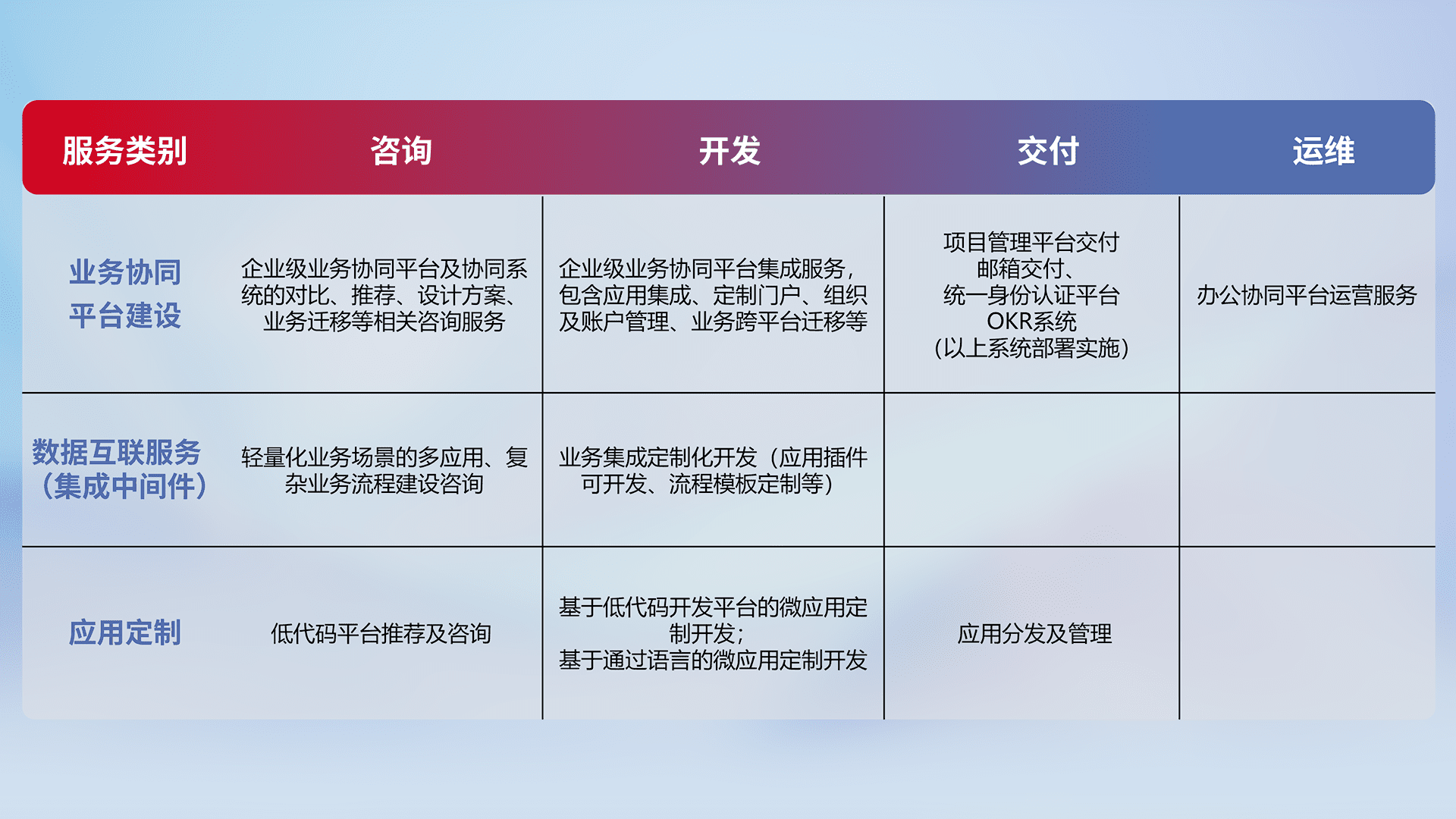 针对钉钉、、企微、、IDaas等平台级产品提供产品的规划、、、、方案、、、、交付、、、定制化开发等服务,,,,实现如统一协同办公、、、智能客户服务、、、混合会议管理、、、、智能数据查询、、、、等业务场景,,,实现数字化转型。。。。